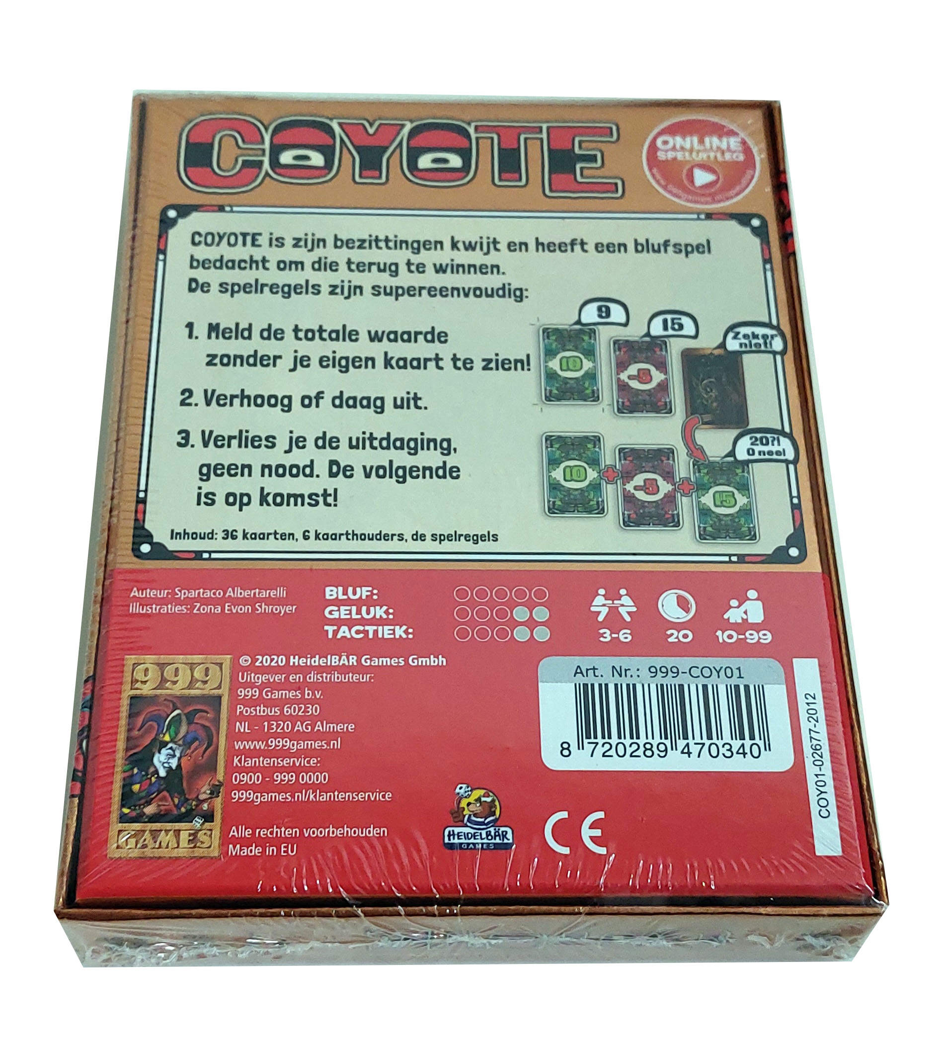 Coyote daagt je uit! Coyote is zijn bezittingen kwijt geraakt en daagt je met een blufkaartspel uit om deze terug te verdienen. Als startspeler schat je de waarde van de kaarten in het spel en breng je een bod uit. Omdat niet alle kaarten hun waarden prijsgeven, zul je moeten bluffen. De volgende speler zal een hoger bod uit moeten brengen of je bod moeten uitdagen. Indien je uitgedaagd wordt en je hebt overboden, verlies je van de uitdager. De speciale kaarten in het spel kunnen de waarde van de kaarten in het spel beïnvloeden, en met een "spiekkaart" mag je geoorloofd spieken, als je daarna tenminste een hoger bod uitbrengt. Ben jij de grootste bluffer!