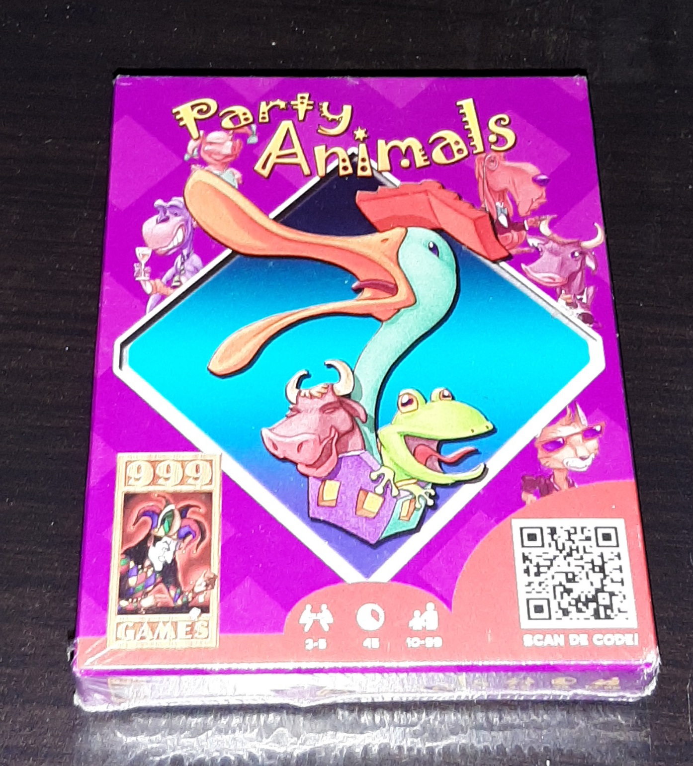Maakt elk feest een groot succes met dit grappige kaartspel. Elke speler heeft zijn eigen dierengeluid. Om beurten draait men een kaart uit de eigen stapel om. wanneer er twee gelijke kaarten op tafel liggen maken de spelers zo snel mogelijk elkaars dierengeluid, tot hilariteit van de anderen. Plotseling knorren de konijnen en grommen de eenden. De leeuw mauwt, terwijl de slang hinnikt. Wie het als eerste goed heeft, verovert de aflegstapel van de ander. Welke speler is de meest veelzijdige Party Animal? Aantal speler: 3-5. Geschikt voor kinderen vanaf 10 jaar.